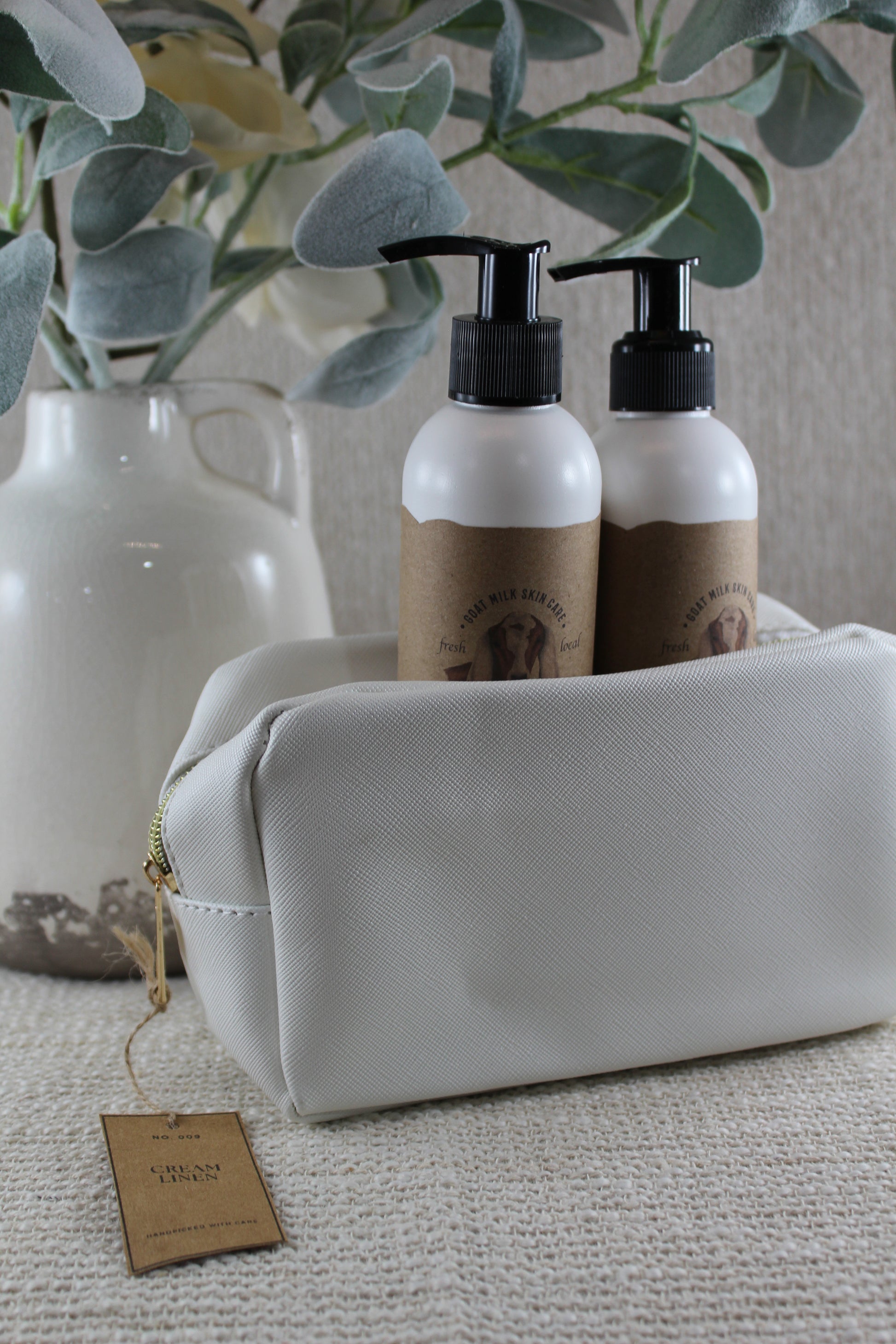 This listing includes the pouch only. For a gift-ready option, explore the Cream Linen Gift Set, which pairs this elegant pouch with an 8 oz lotion, 8 oz sugar scrub, and full-size soap—for just $35.