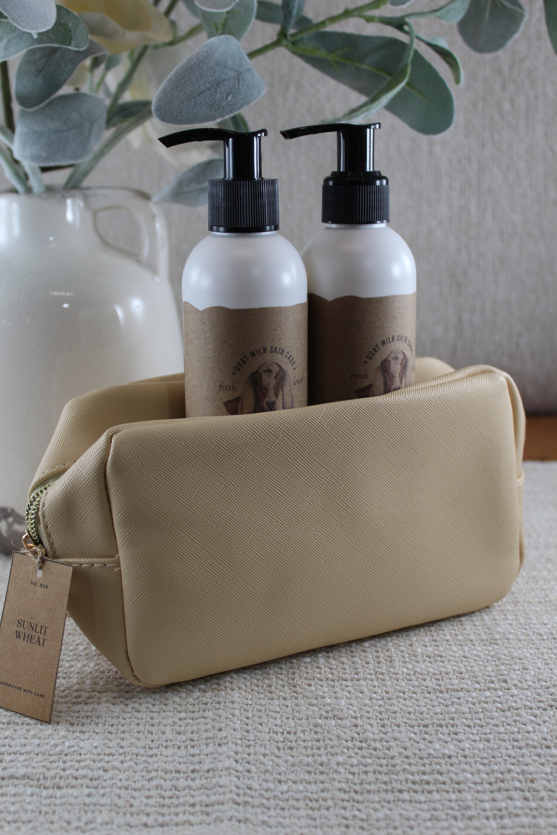 This listing includes the pouch only. For a gift-ready option, explore the Sunlit Wheat Gift Set, which pairs the same elegant pouch with an 8 oz lotion, 8 oz sugar scrub, and full-size soap—for just $35.