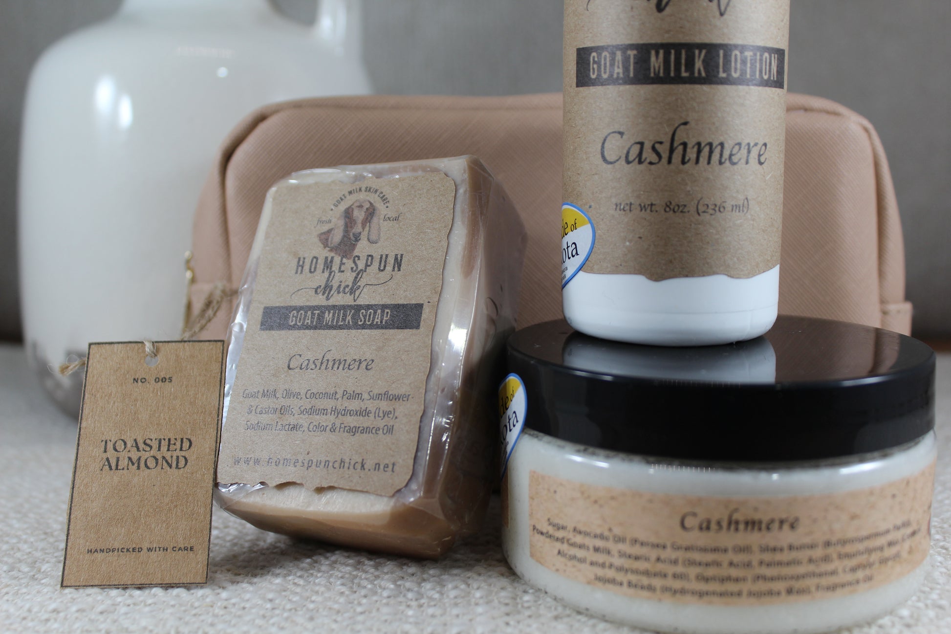 This listing is for the pouch only. To enjoy the full gift-ready experience, check out the Toasted Almond Gift Set, which includes the same lovely pouch, an 8 oz lotion, 8 oz sugar scrub, and full-size soap—for just $35.